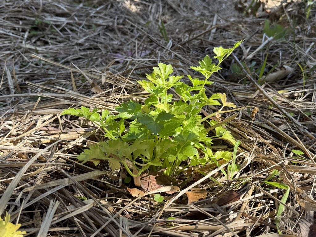 すぐに野菜を見に行くと、昨年11月に植えたブロッコリー、キャベツ、セロリ、パセリ、春菊など、たくさんの野菜たちが水やりも何もしていなかったのですが大きく育っていました。もともと庭のような場所で、土も耕さずに植えたので、育つかどうか心配に思うこともありましたが、実際に育った姿を目にして土壌や自然生物の偉大さを実感しました。